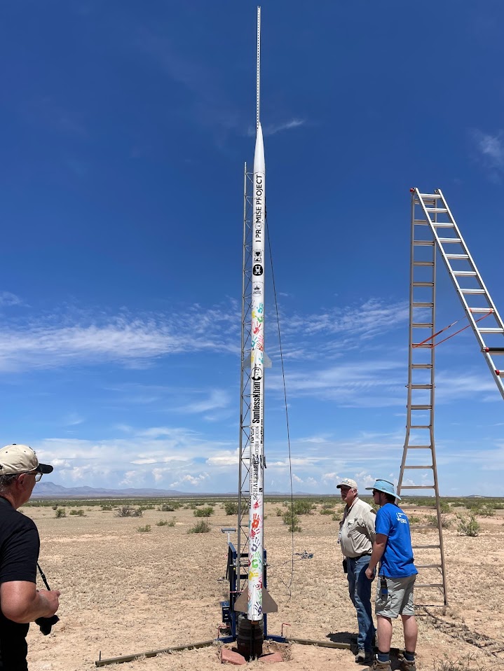 IPromise was a 22ft tall, two-stage rocket competing in the 30,000ft SRAD category. A successful launch and separation was unfortunately followed by the sustainer bodytube splitting around 17,000ft due to a manufacturing error. Recovery of the booster was successful, but the sustainer came down ballistic.