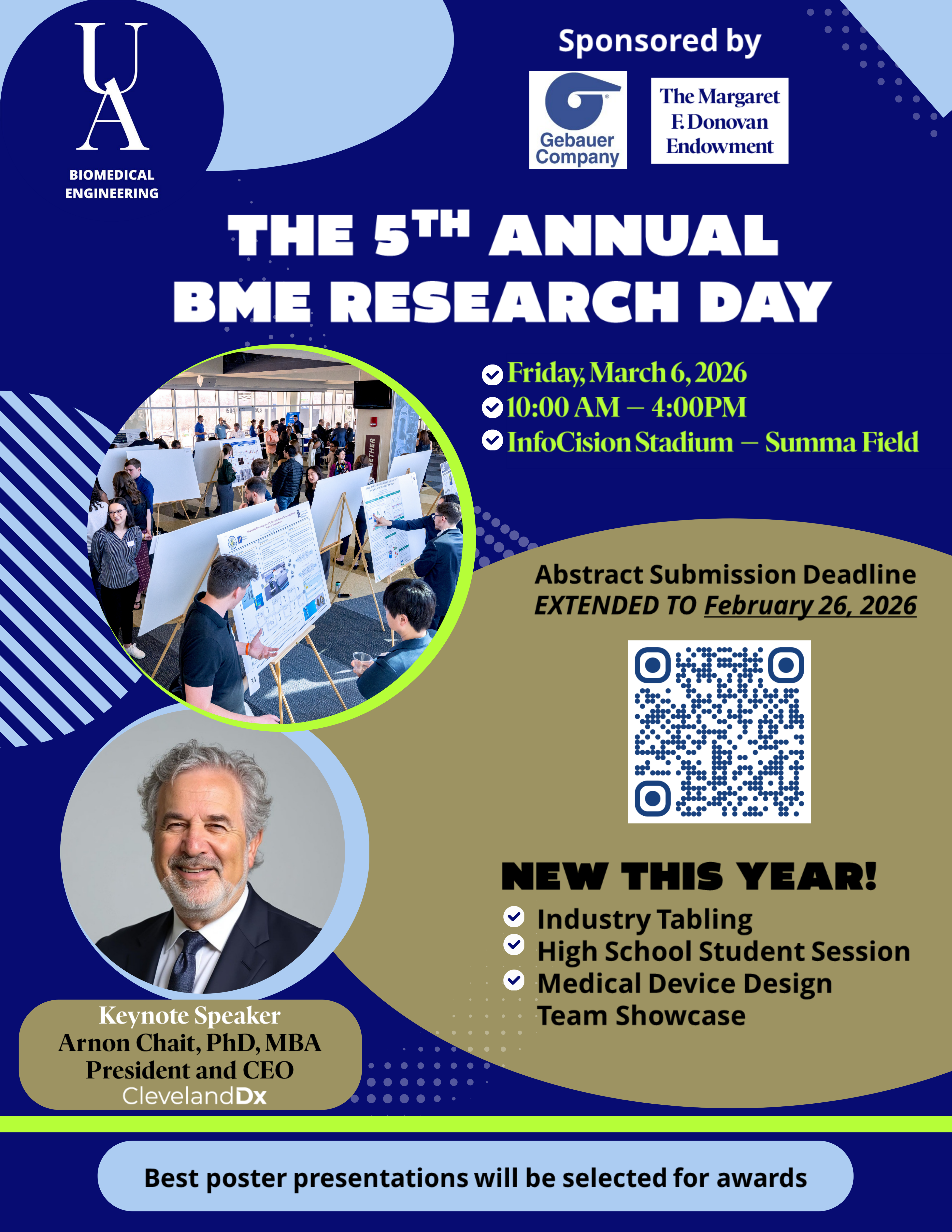 Home 5th Annual BME Research and Design Day Abstract submission deadline has been extended to February 26, 2026!! Please reach out with any questions by contacting Dr. Audrey Nguyen-Rudy (anguyen@uakron.edu)
