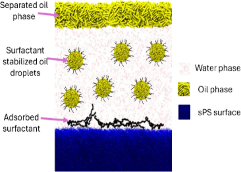 The separation of stable oil-water emulsions is a significant challenge, often requiring materials that can effectively disrupt the surfactant layer at the oil-water interface. This work examines how the surface energy of different high surface area polymer gels dictates their efficiency in separating emulsions through surfactant adsorption. Experimental results were interpreted using atomistic simulations, which detailed the distinct adsorption behaviors and structural configurations of short-chain versus long-chain surfactants on the polymer surface. The study demonstrates how combining experimental analysis with simulation techniques provides a molecular-level understanding of the emulsion separation process.