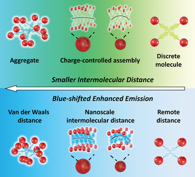 Measuring intermolecular distance in non-crystalline assemblies is a major analytical challenge. This study uses novel macromolecules with aggregation-induced emission (AIE) to show that their fluorescence wavelength directly reports on intermolecular distance across different molecular states. Molecular dynamics simulations support experimental data by showing that closer molecular packing restricts conformations, causing a predictable blue-shift in fluorescence. This work offers a versatile method for sensing intermolecular spacing, which is useful for designing functional nanomaterials.