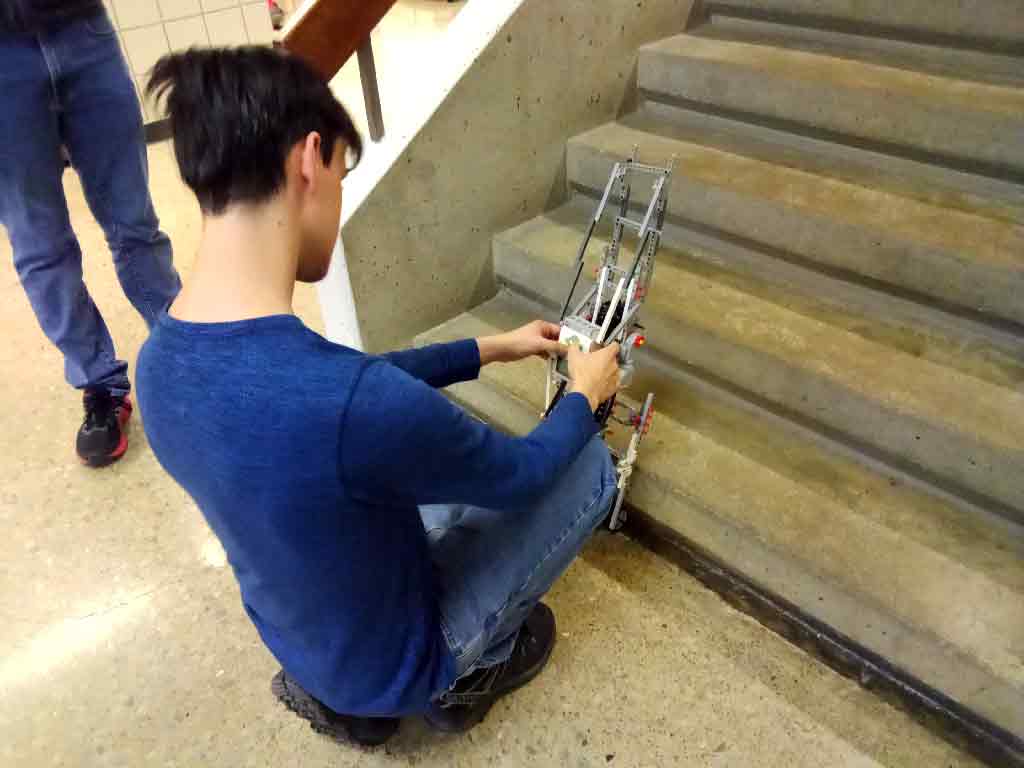 As end of semester draws near in December, Tools for Engineering students prepare for two challenging assignments: building robots that climb stairs and compete in the Battles Bots tournament. The former is particularly challenging as few robots can climb an entire flight of stairs. This leads to interesting, aspiring designs! Robots are built from LEGO Mindstorms kits.