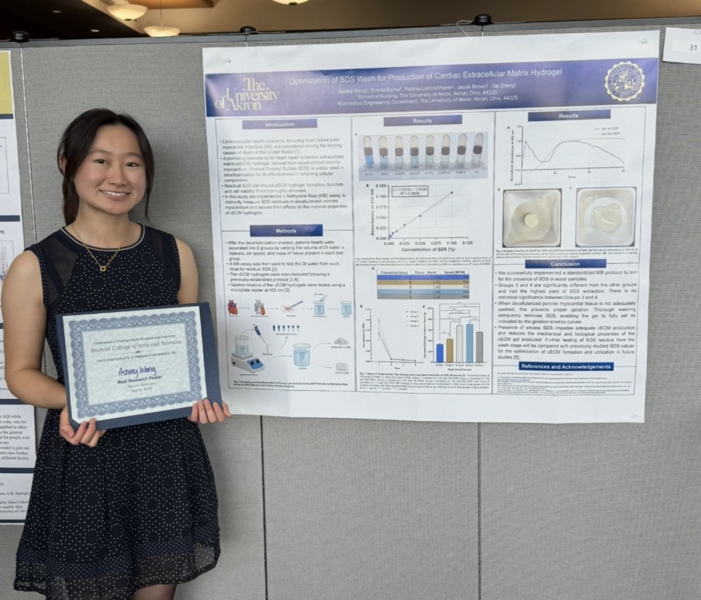 Ashley placed second among the undergraduates at the 4th annual BME Research Day Poster Competition. Her poster, “Monitoring of Chemical Reagent Residuals in Cardiac Tissue Decellularization”, provided many insights into the timeline of the protocol of the synthesis of the cECM hydrogel and it was awesome to see her hard work be recognized!